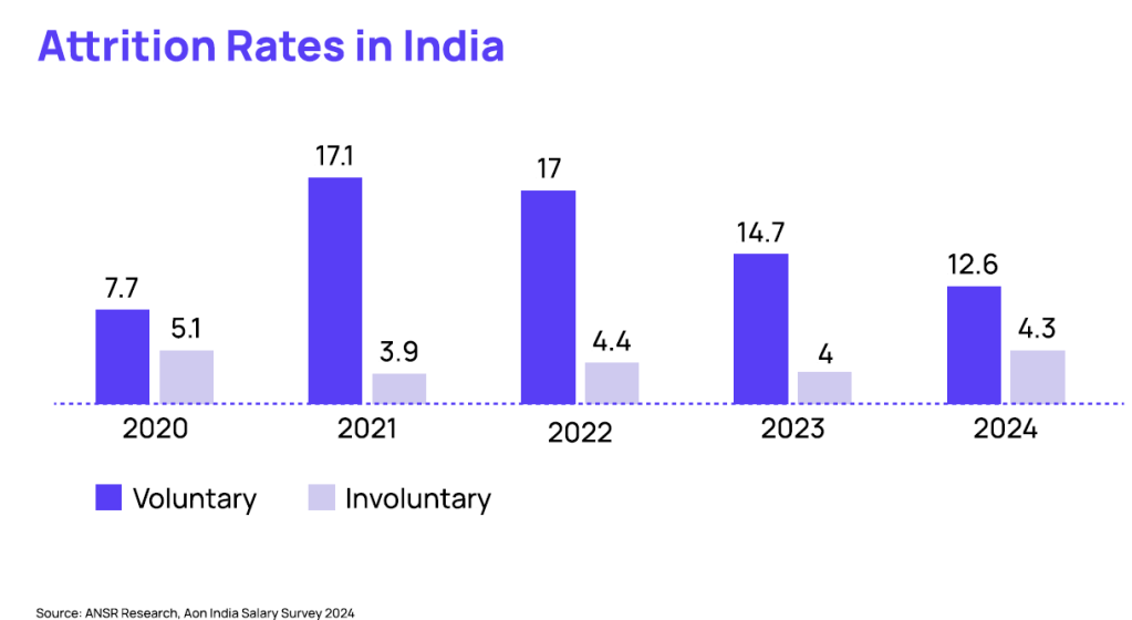 Even with pay hikes, attrition remains a critical concern. According to the Talent500 report, involuntary attrition has dropped from over 21% during the post-pandemic peak to 16.9% in 2024, with voluntary attrition hitting a low of 12.6%—a positive sign, but not a full fix.