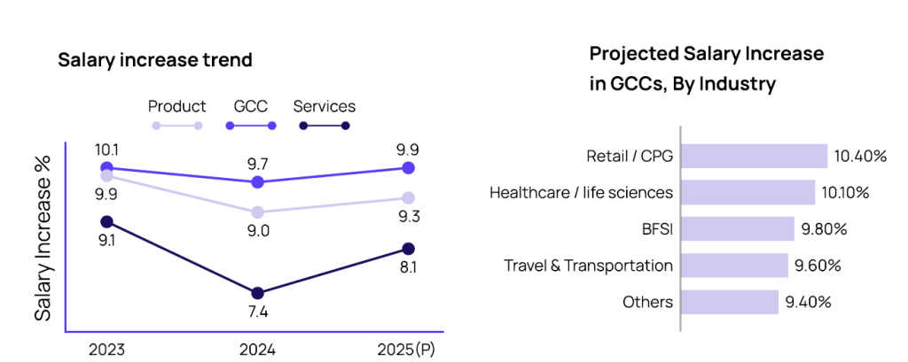 Despite macroeconomic caution, the report reveals that GCCs are doubling down on investments in critical talent. While the average hike is 9.9%, high-demand roles in cloud, AI, product, and cybersecurity are commanding even higher premiums.